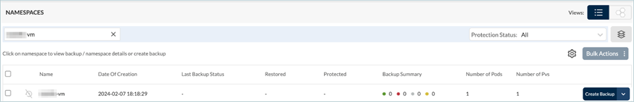 - Click Create Backup, under NAMESPACES, to start the wizard.
